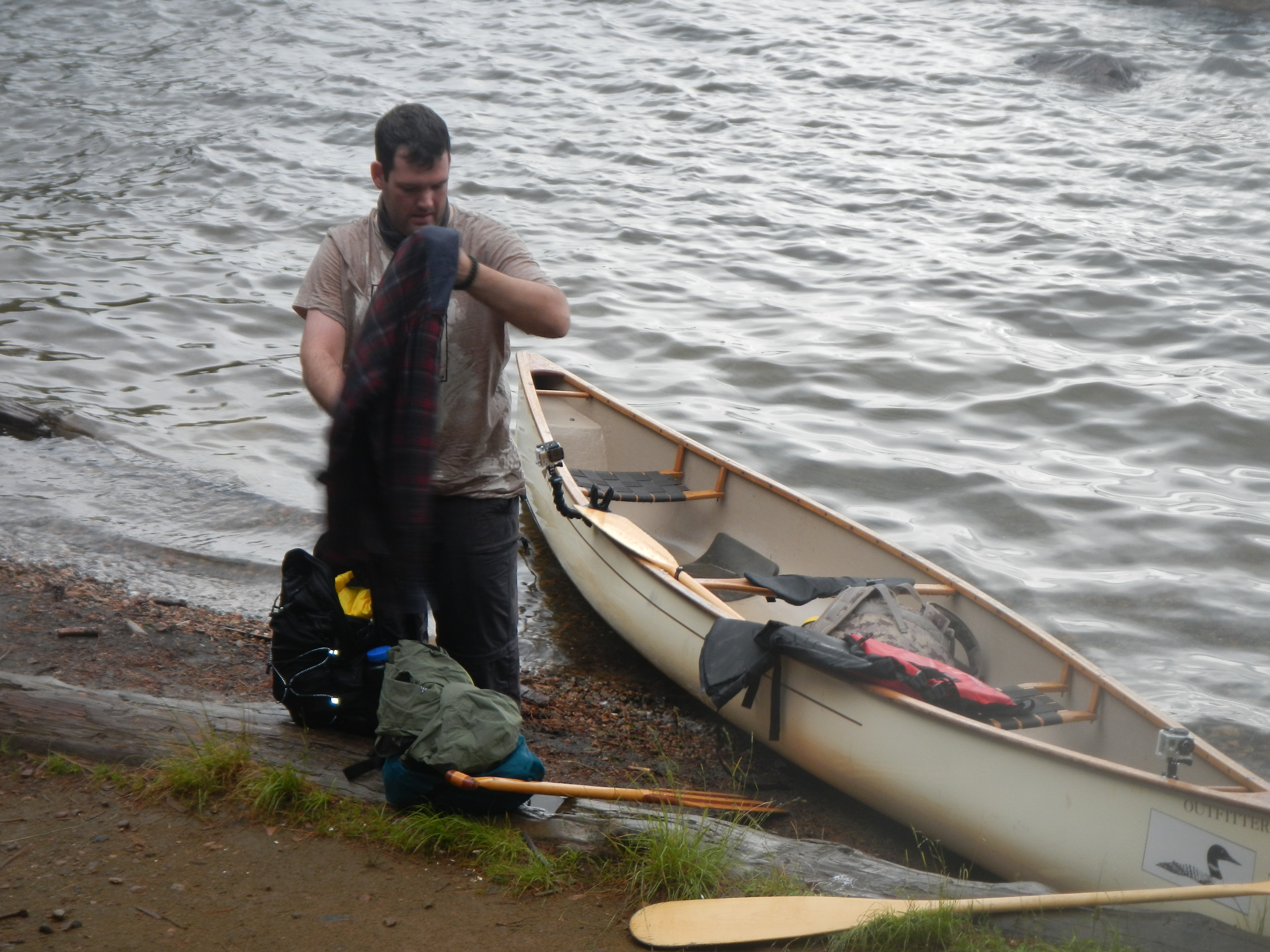 Burnt Island Lake is slowly exposed as a large lake, we paddled out of a small bay making our way to the main body of water to cut straight across it. I recall seeing a moose trying to swim part of it while we were on the return leg of the run. We canoed past Gull Island and the seagulls began flying and diving close to us to let us know we were too close to their nests. As we crossed the lake, the drizzle turned to a full rain and we, now soaked through, decided to push on to the next portage without stopping. Once there I traded my flannel shirt for a rain coat.